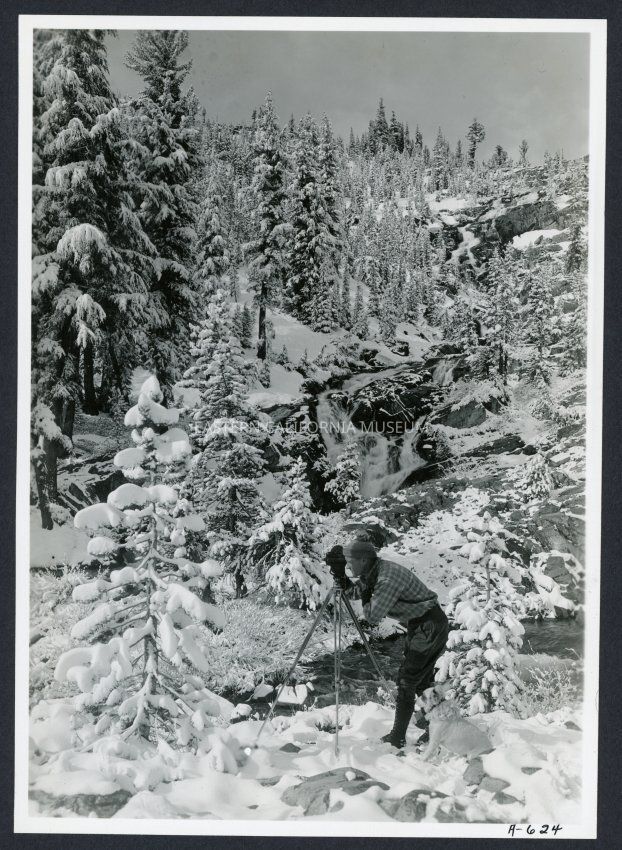 This photo is of Burton Frasher and his dog in a winter scene. Frasher is taking a photograph in front of a waterfall.