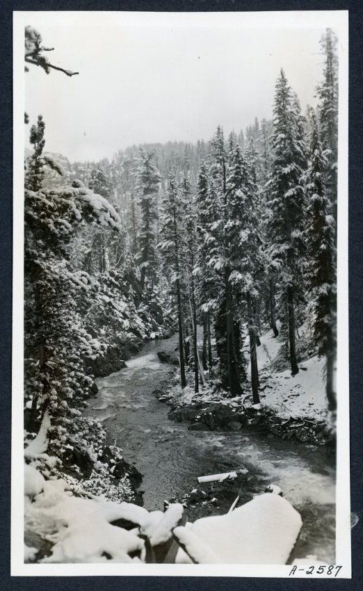 [No label, and it seems to have been skipped in the inventory.] [No label] A-2587 This is a photo taken from a high vantage point of a river surrounded by trees and snow.