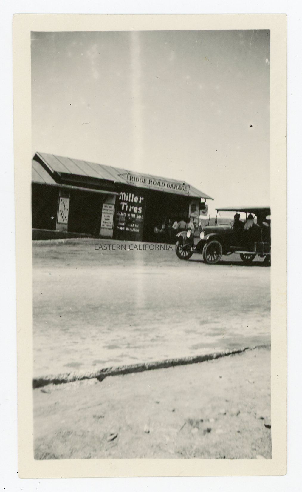 Photo of the Ridge Road Garage. There is an early vehicle parked in front and an advertisement for Miller Tires on the side of the building.