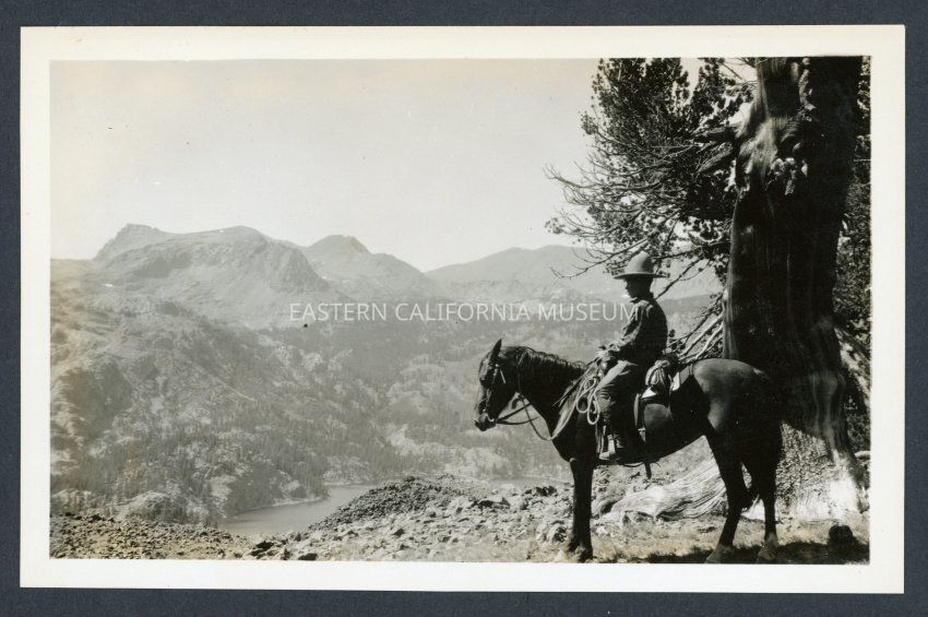 This photo is of a boy, likely Burton Frasher Jr., on a horse with a lake and mountain vista in background.