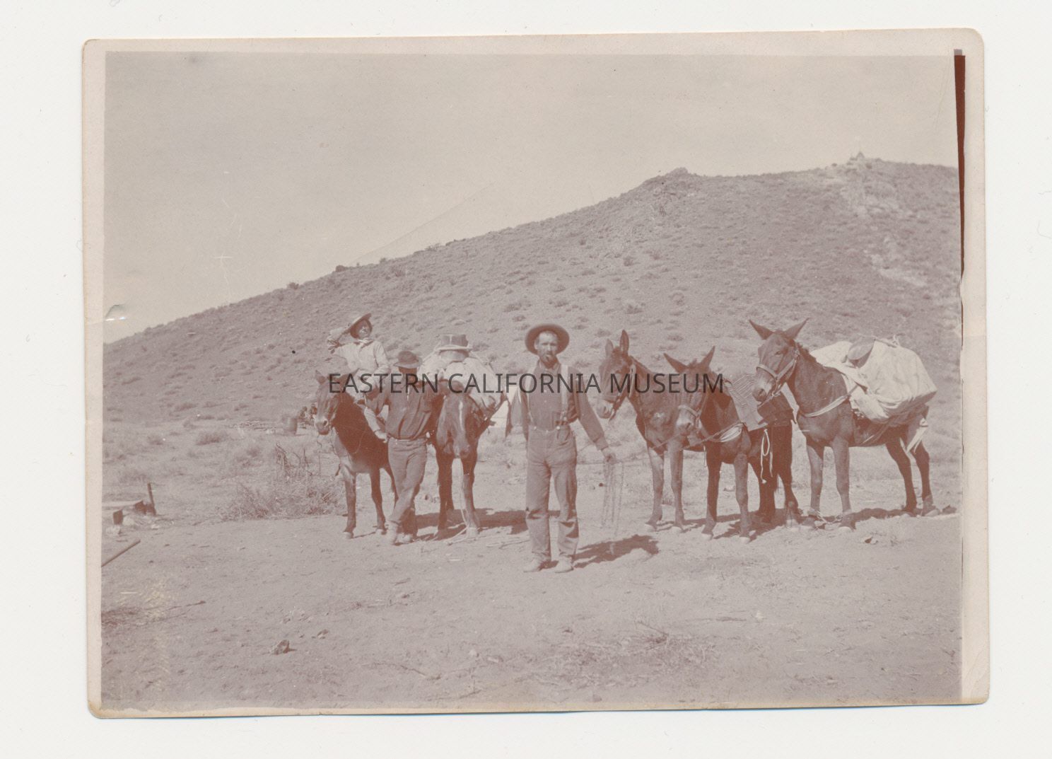 Photo of two men and a woman with horses and a pack train in the desert.
