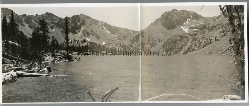 This is a panorama printed on two sheets with cloth backing. Stamped on back is "Frasher's 158 E. Second Street Pomona Calif." Handwritten in pencil on reverse is "7-458" and "East Lake (Fosters Green Lakes Camp)".