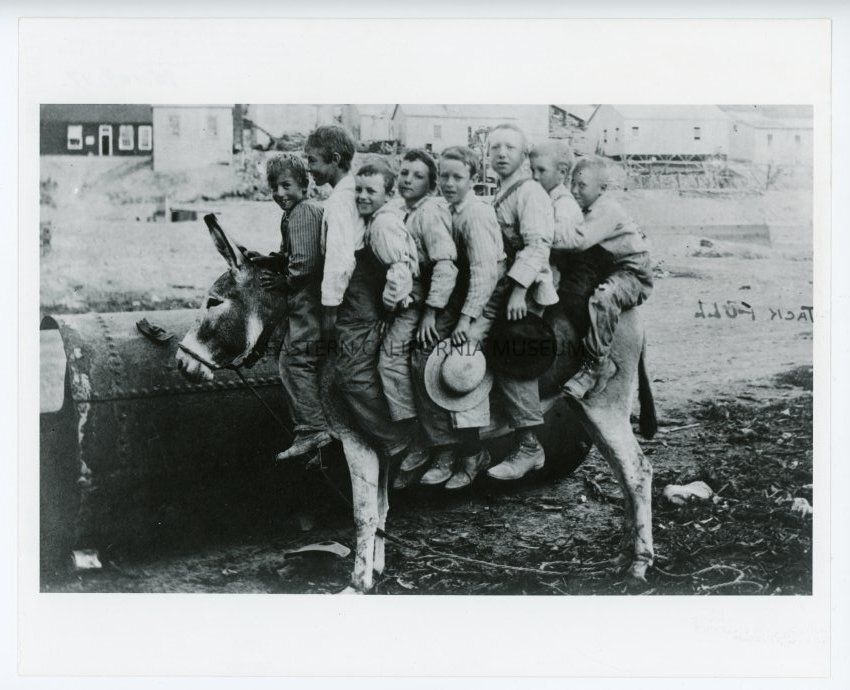 Photo of eight boys sitting on a mule. Photo appears to have been printed in reverse. Written on front: Pack Full.