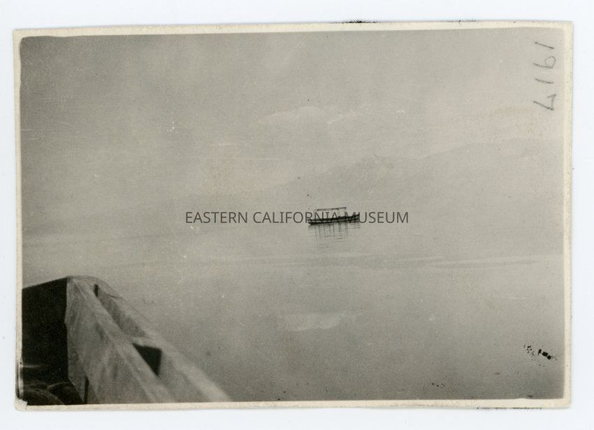 Black and white photo of Owens Lake with a boat on it, 1917.