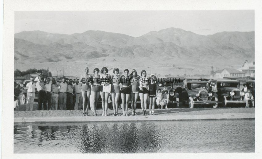Eight ladies lined up at the edge of the pool at the Keeler Beach and Swim Club, Keeler, circa 1929. There are many cars and spectators in the background.