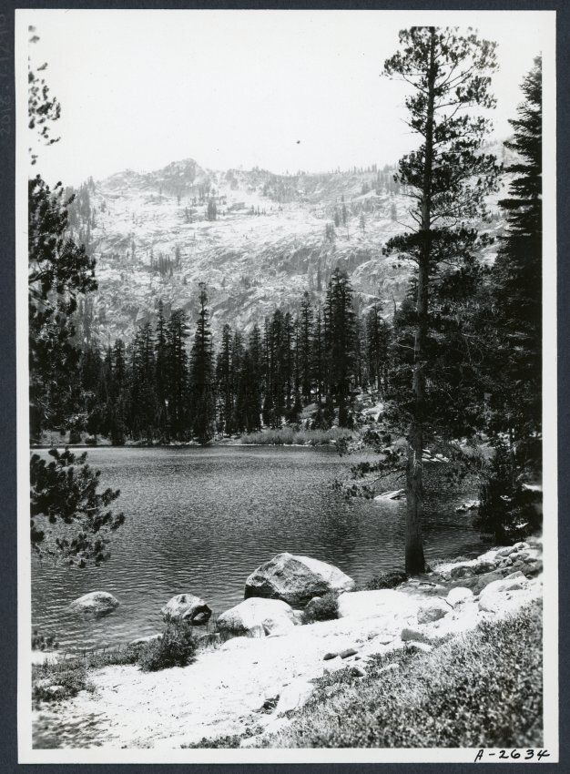 [No label, and it seems to have been skipped in the inventory.] [No label] A-2634 This is a photo of a lake with trees, rocks, and mountains. Maybe Lower Angora Lake?