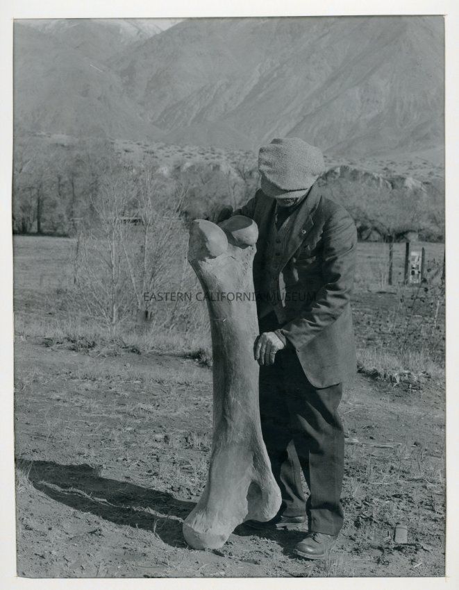 Photo of Mr. Ramsey holding a mammoth bone. It is the same mammoth femur bone in the museum (A150.1-14).