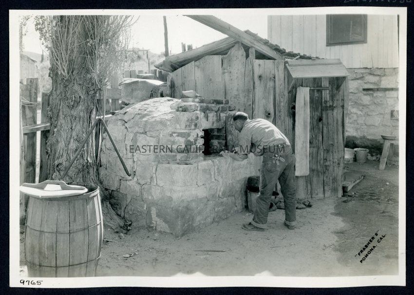 [No label, and it seems to have been skipped in the inventory.] Frashers Pomona Cal. 9765 This is a photo of a man using an old outdoor oven at Benton Dude Ranch.