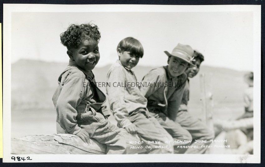 Rodeo Days at Benton Dude Ranch Mono Co. Calif. Frashers Foto Pomona 9842 From left to right: Howard Meredith, Harry Keller, unidentified boy.