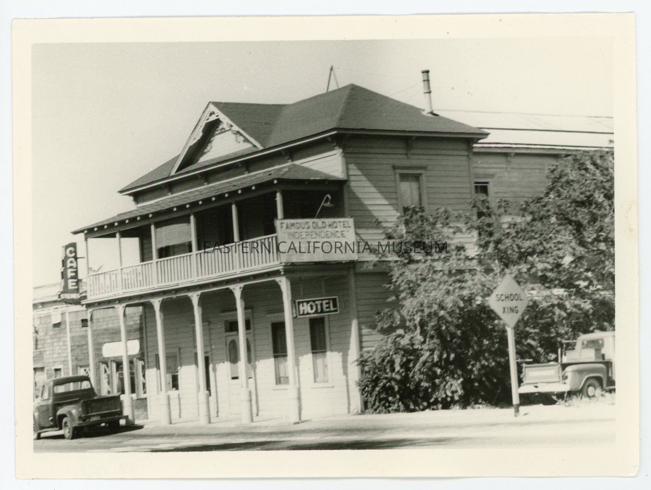 Photo of the Independence Hotel taken in 1953 by Eugene Barrows. There is a cafe next door to the hotel and a couple of pickup trucks parked around it.Photograph Details