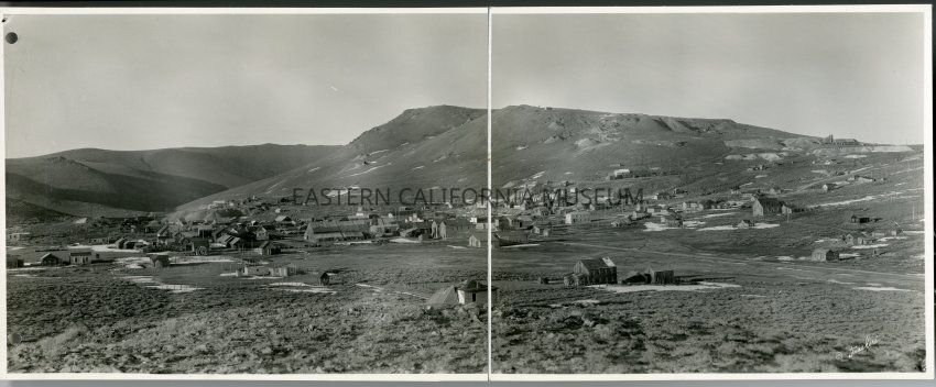 This is a panorama printed on two sheets with cloth backing. Stamped on back is "Permission to Publish Frashers Copyrighted Photos Must be Secured From Frashers Inc. Pomona, Calif. Photo No. 7-38." This is a photo of Bodie.