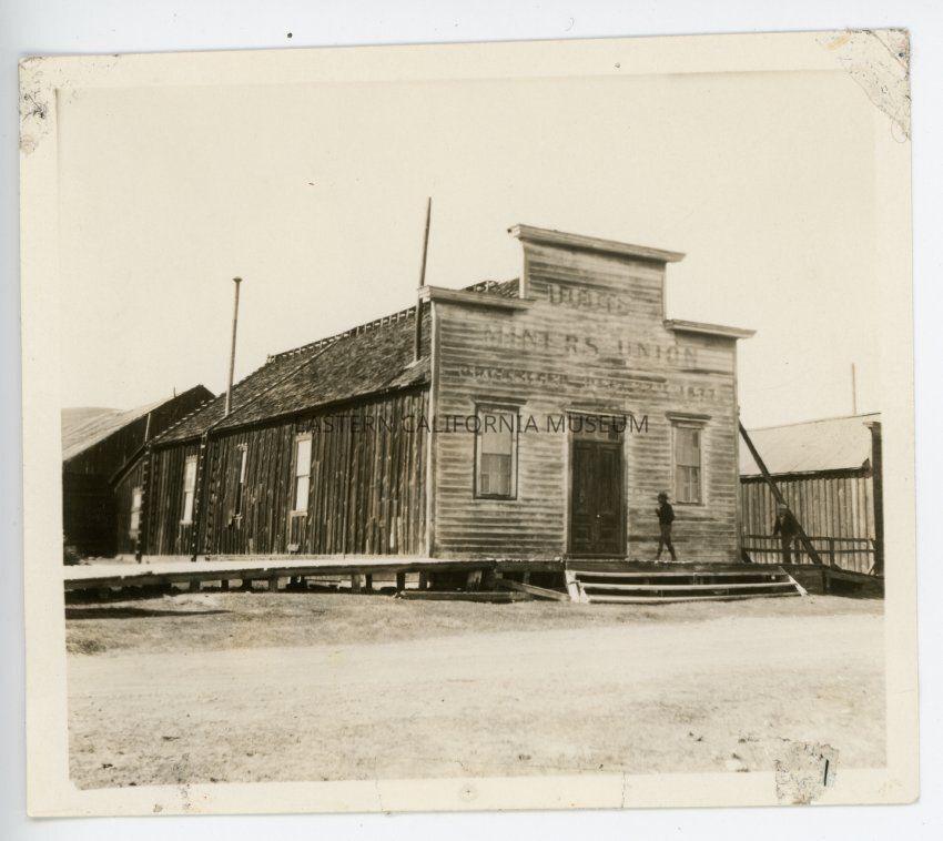 Handwritten in pencil on reverse: "Bodie Miners Union Organized --?-- 22nd 1877". This is a small photo of a wooden building whose painted sign is just barely visible. There are two people (maybe one is Burton Frasher Jr.?) walking along the boardwalk in front of the building.