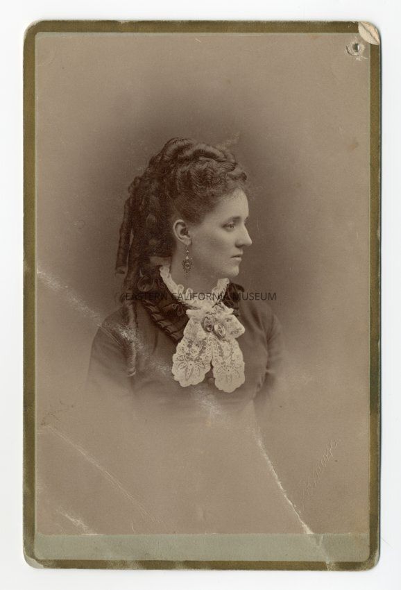Mounted studio portrait of a woman with an elaborate curled hairsytle, a white lace ruffle at her neck, and is wearing large dangling earrings and a large necklace.