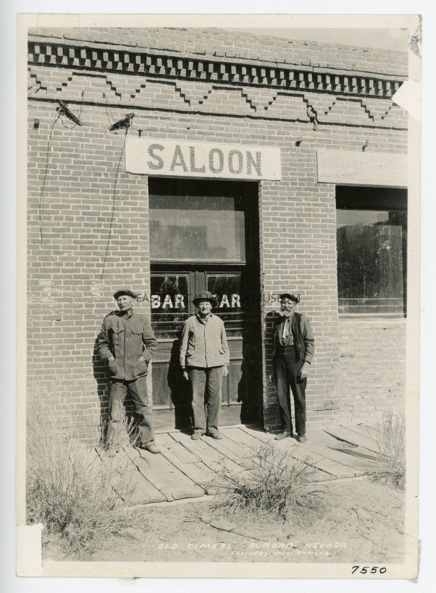 This photo is loose, but appears to have been torn out of an album. It is printed on Velox paper. There are signs for "Saloon" and "Bar" on the building.