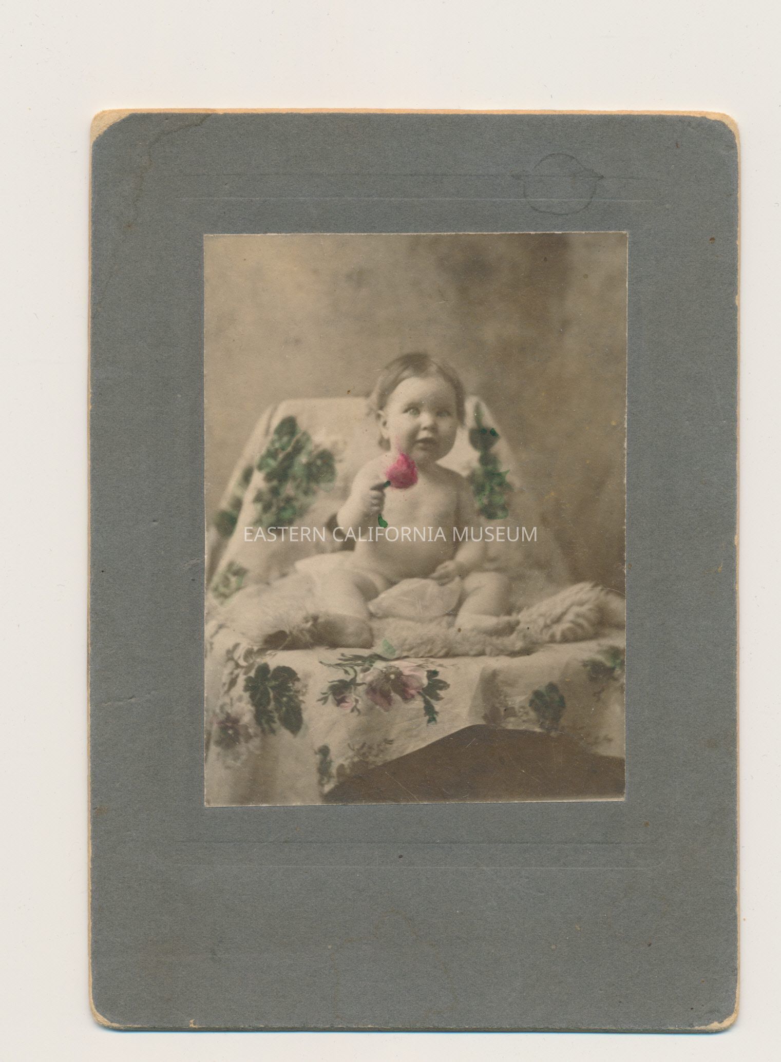 Mounted studio portrait of a baby holding a rose. It has been partially tinted.