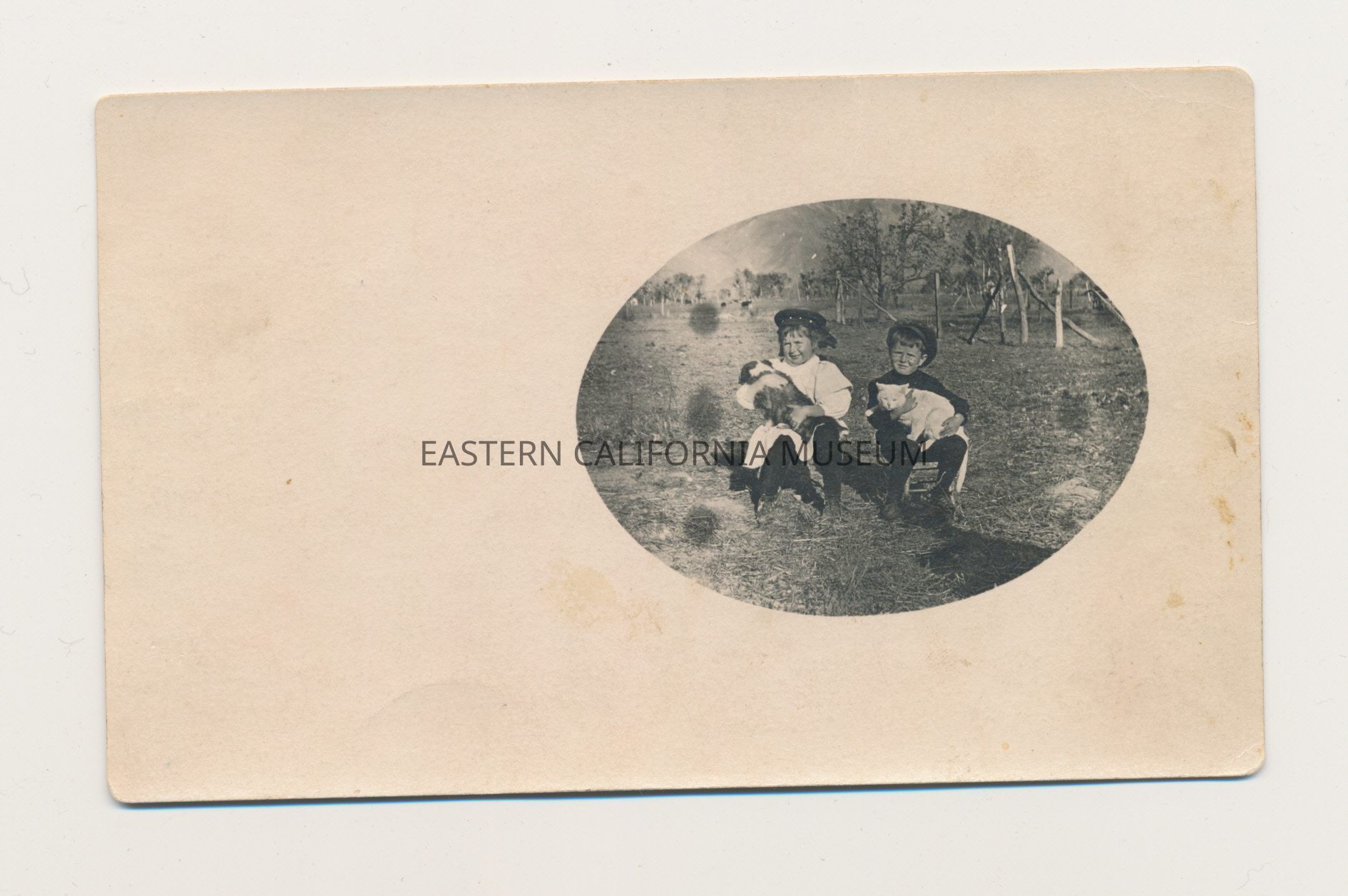 Photo postcard of two children seated in a field holding animals (a dog and a white cat).