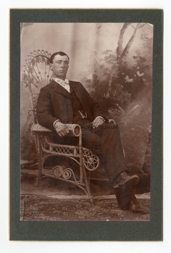 Mounted studio portrait of a man wearing a bowtie sitting in an ornate wicker chair. He has a watch chain on his vest, but no other visible jewelry.