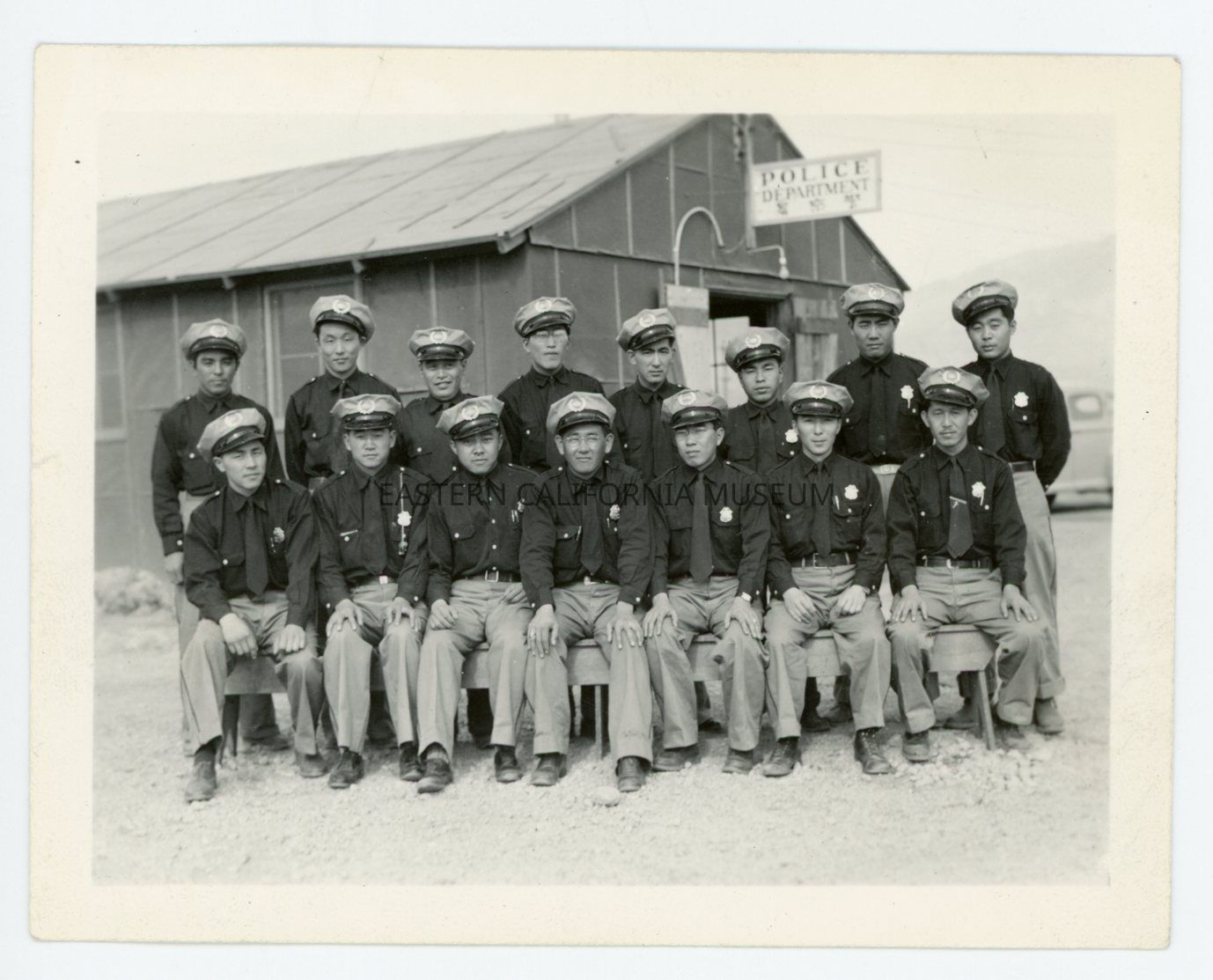 Photo of 15 members of the Internal Security Department at Manzanar War Relocation Center. They are in two rows (one sitting on a bench, one standing behind) in front of the Police Department building.