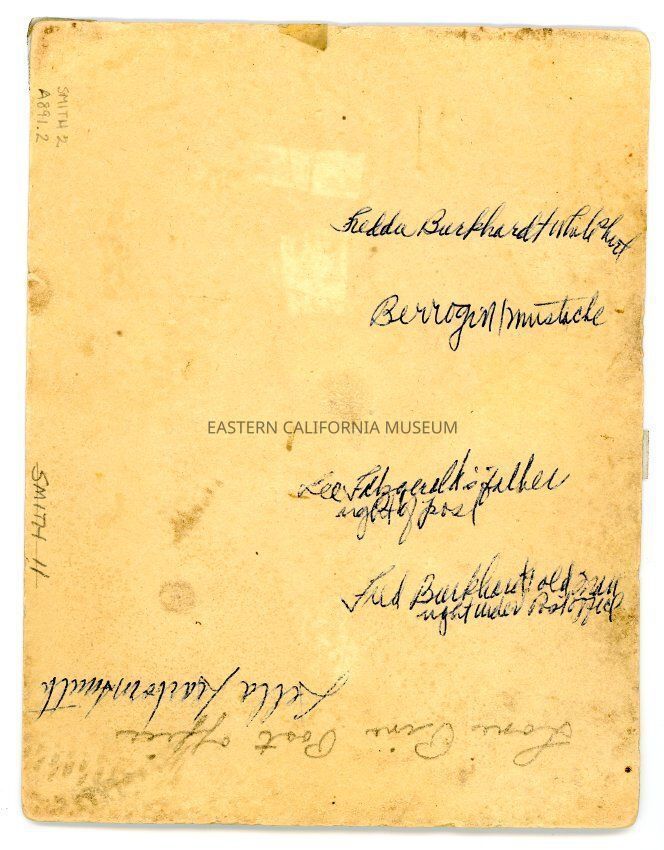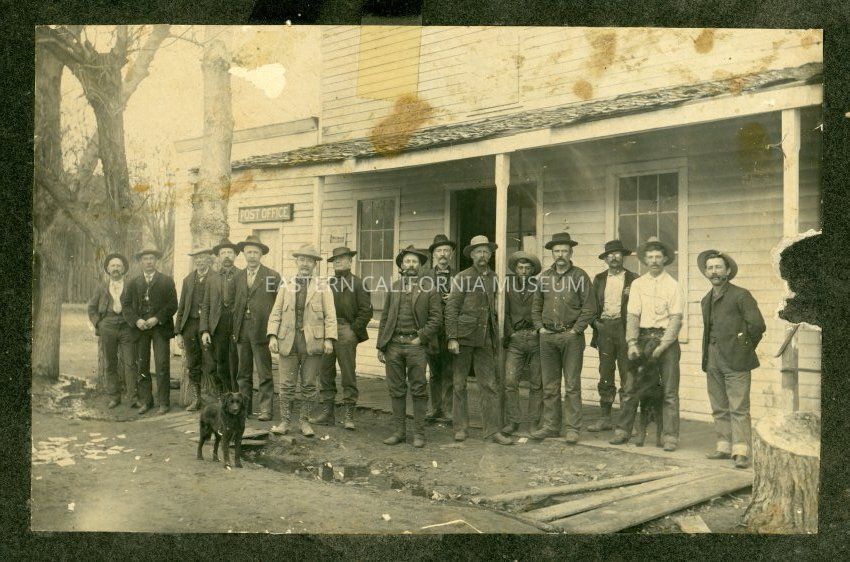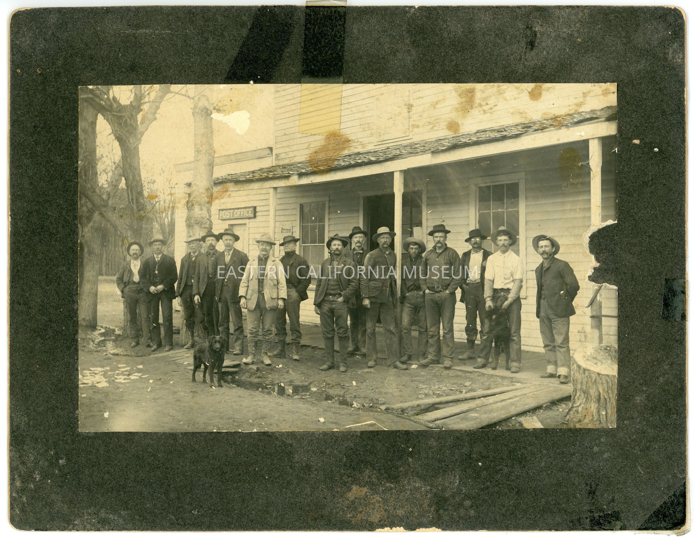 Mounted photo of a large group of men (and two dogs) in front of the Lone Pine Post Office. Some of the men have been identified on the reverse: Freda Burkhardt (white shirt), Berrogin (mustache), Lee Fitzgerald's father (right of post), and Fred Burkhardt (old man right under Post Office).
