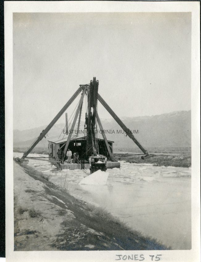 Electric powered dipper dredge breaking up ice along the L.A. Aqueduct. Note the stablizing arms planted on channel berms and large ice chunk in front of shovel.Collection