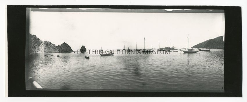 Copy of a panorama photo of Avalon Bay on Santa Catalina Island. Photo appears to have been taken from a boat in the middle of the bay looking out toward the ocean. Likely a Ramsey photo.