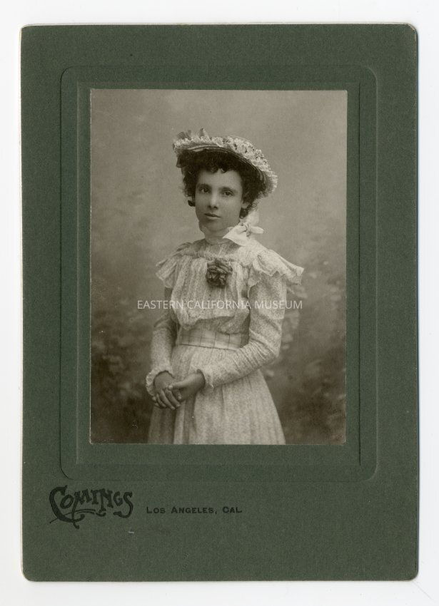 Mounted studio portrait of a young girl with dark hair wearing a hat, a large rose pinned to her dress, and a bow around her neck. The hat is trimmed with lace, fabric, and flowers. She is clasping her hands in front of herself.