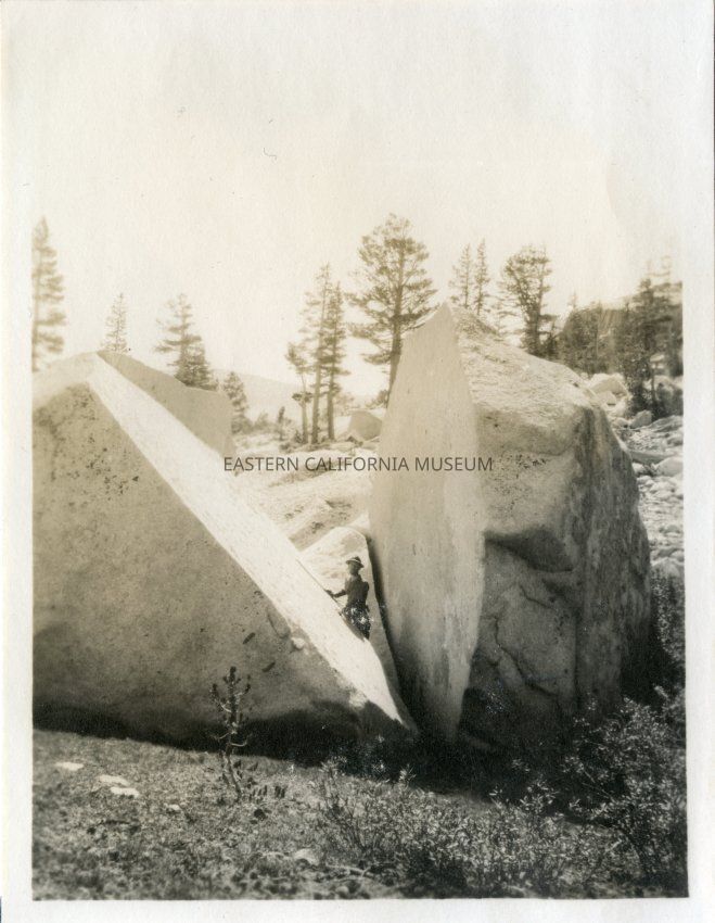 Photo of a man posing inside a massive split boulder.