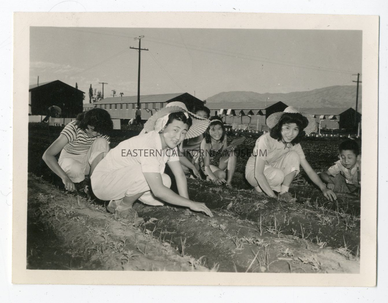 B/w photo of approximately six women and children working in the fields at Manzanar War Relocation Center. There are several barracks in the background.Photograph Details