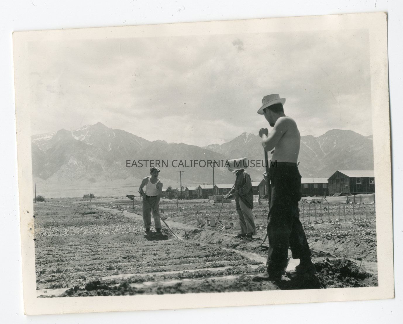 B/w photo of three men tending to the fields at Manzanar War Relocation Center. There are many barracks in the background and the Sierra Nevada mountain range.