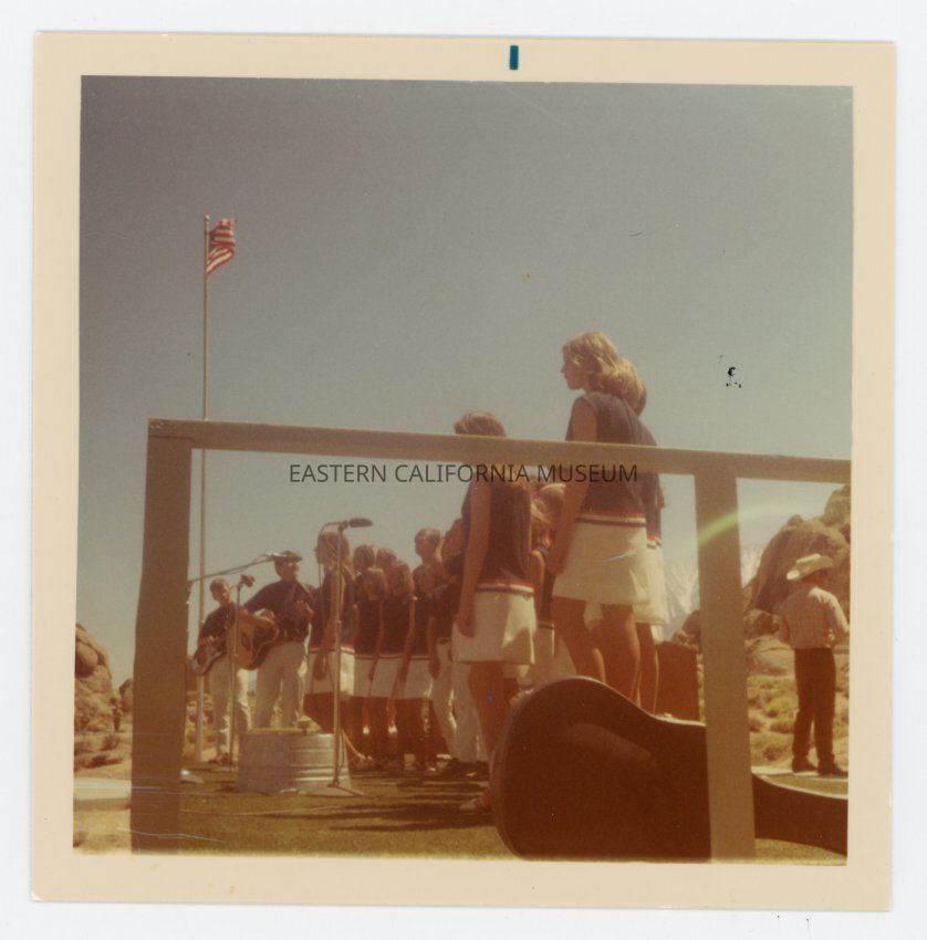 Color photo of a group of young women and men performing (singing, playing guitar) on a stage in the Alabama Hills.