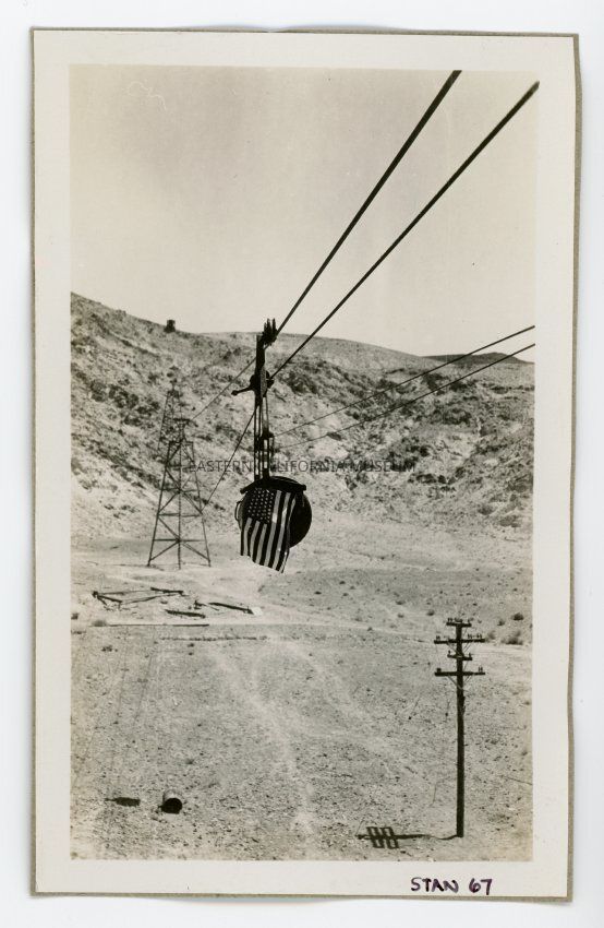 Photo at the tramway terminal by Owens Lake. The flagged bucket was the first one across the mountains in July 1913.