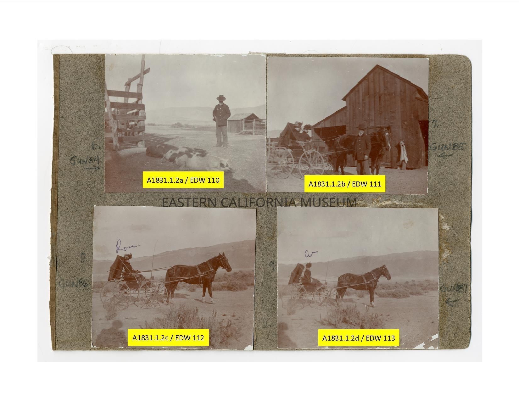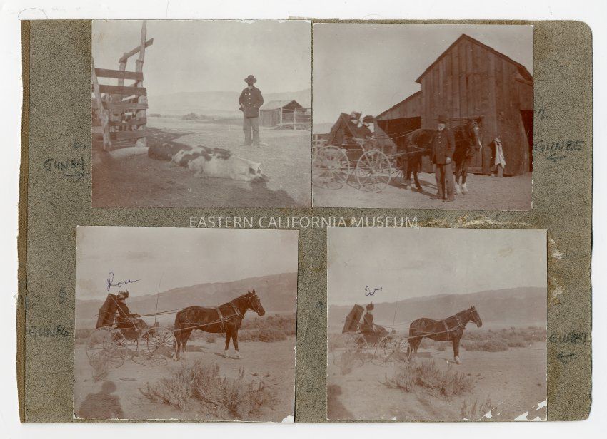 A1831.1.2b: Photo of a man (John Shepherd) standing next to a horse-drawn buggy with two women inside (Lou Irwin or Louella and Eva Lee?). They are parked in front of a barn. Likely taken at the Shepherd Ranch on Georges Creek.