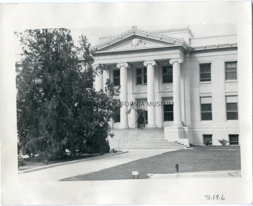 Black and white photo of Harold "Skinny" Gates on horseback carrying an American flag down the steps of the Inyo County Courthouse as part of the inaugural trip of the Highway Post Office, July 14-15, 1952.