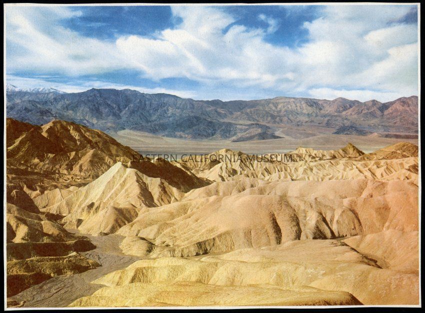 Colorized photograph of the Zabriske Point area in Death Valley National Park. The Panamint range can be seen in the background.Collection