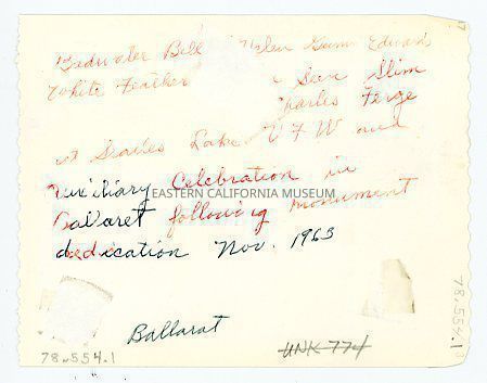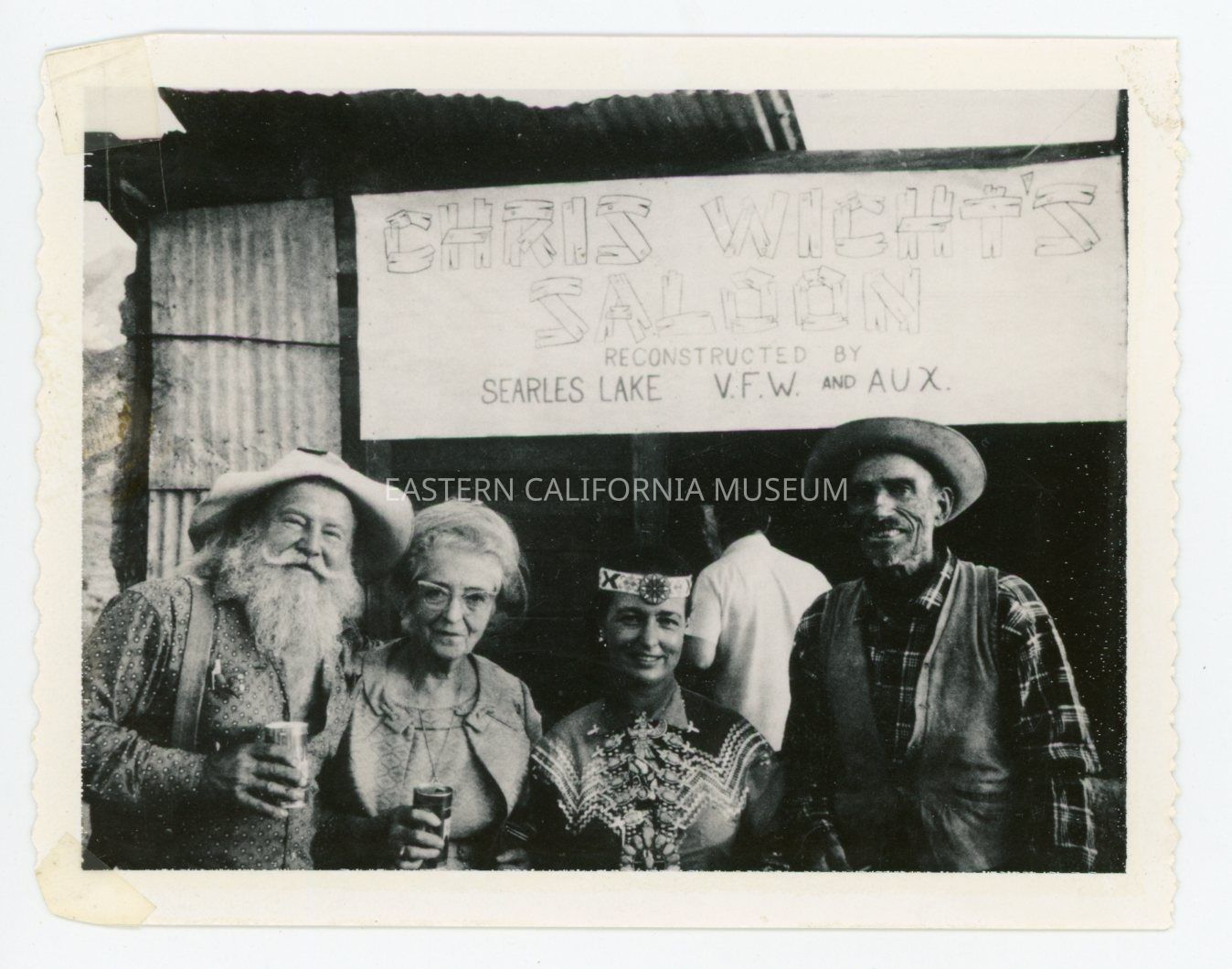 Photo of (from left to right) Badwater Bill, Helen Gunn Edwards, White Feather, and Seldom Seen Slim (Charles Ferge) at Ballarat. The event was the Searles Lake VFW and Auxiliary celebration of the monument dedication in November 1963.