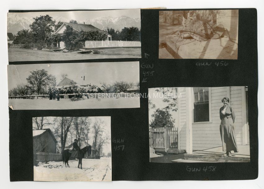 A1831.3.22a: Long photo of a house with a bright white picket fence along one side. There are two wooden bridges over a ditch in front of the house. Sierra Nevada mountain range in background. It is identified as the Dehy house in Independence.