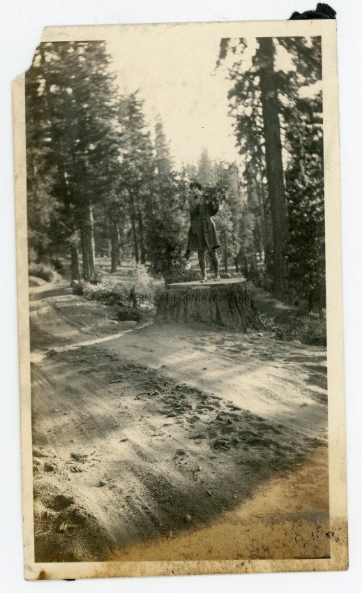 Photo of a woman standing on a large tree stump to the side of a dirt road. She appears to be holding something (branches?) in her left hand.