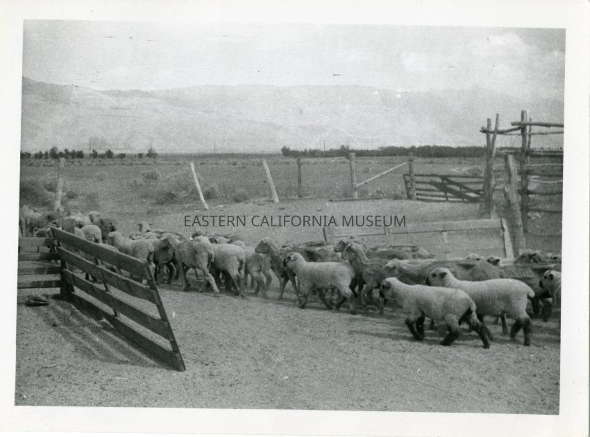 B&W glossy print: flock of sheep being herded into a corral