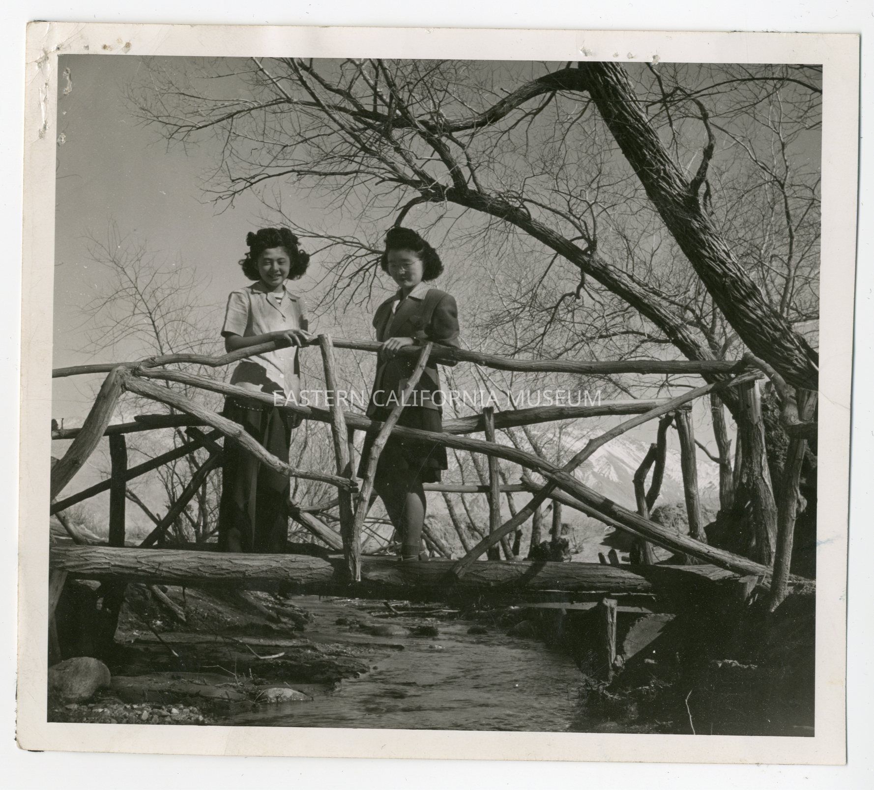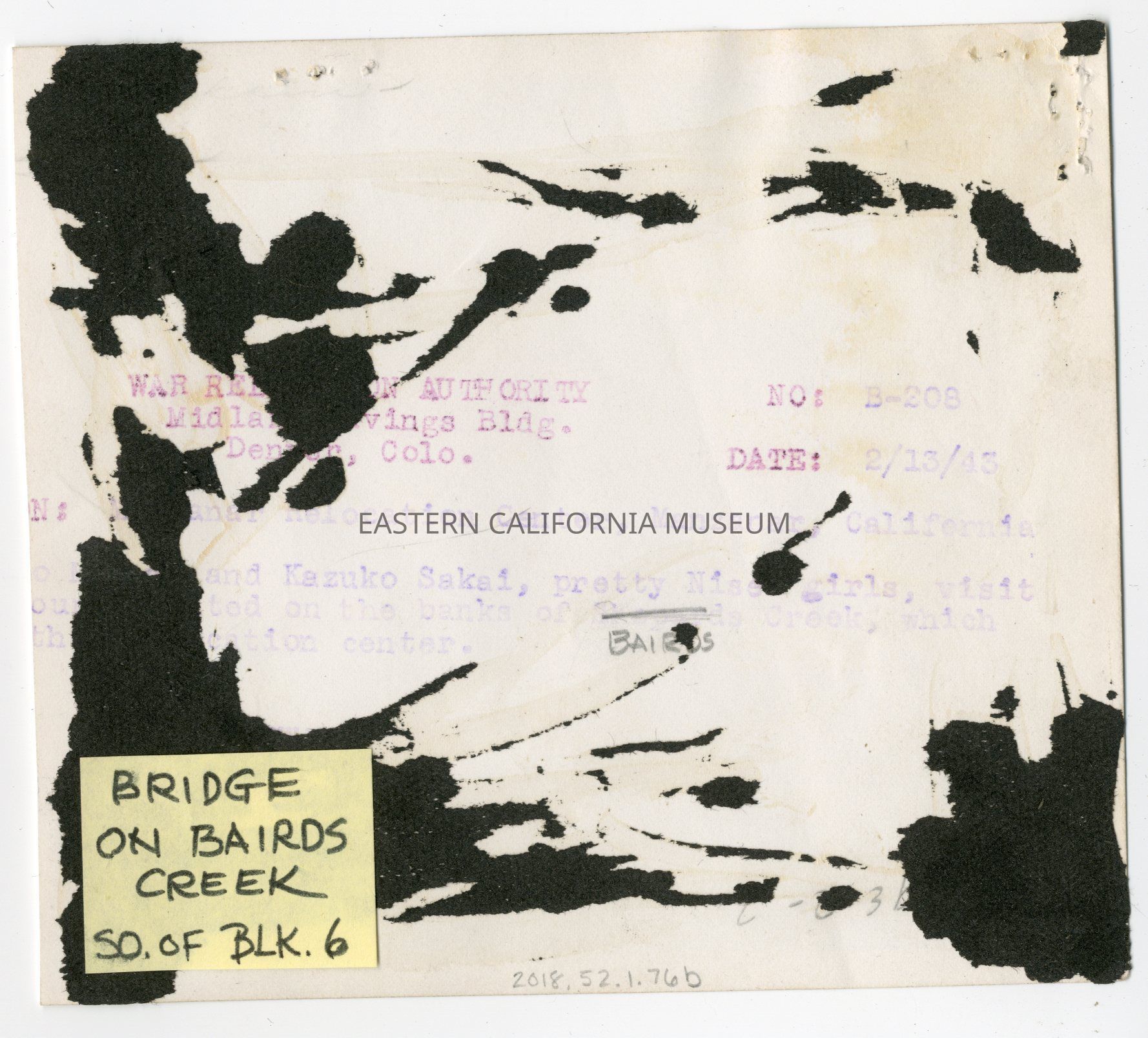 Stamped on reverse with the War Relocation Authority photo information. It is only partially legible, but can make out "No. B-208", "Date: 2/13/45", and "---and Kazuko Sakai, pretty Nisei girls, visit --- on the banks of Bairds Creek, which ---."