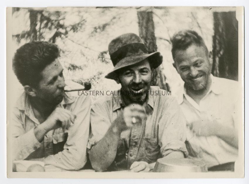 Photo of three man in the backcountry laughing together. From left to right is Charlie Robinson, packer, Wiliam G. Cross, and the brother of William Cross (name unknown).Collection