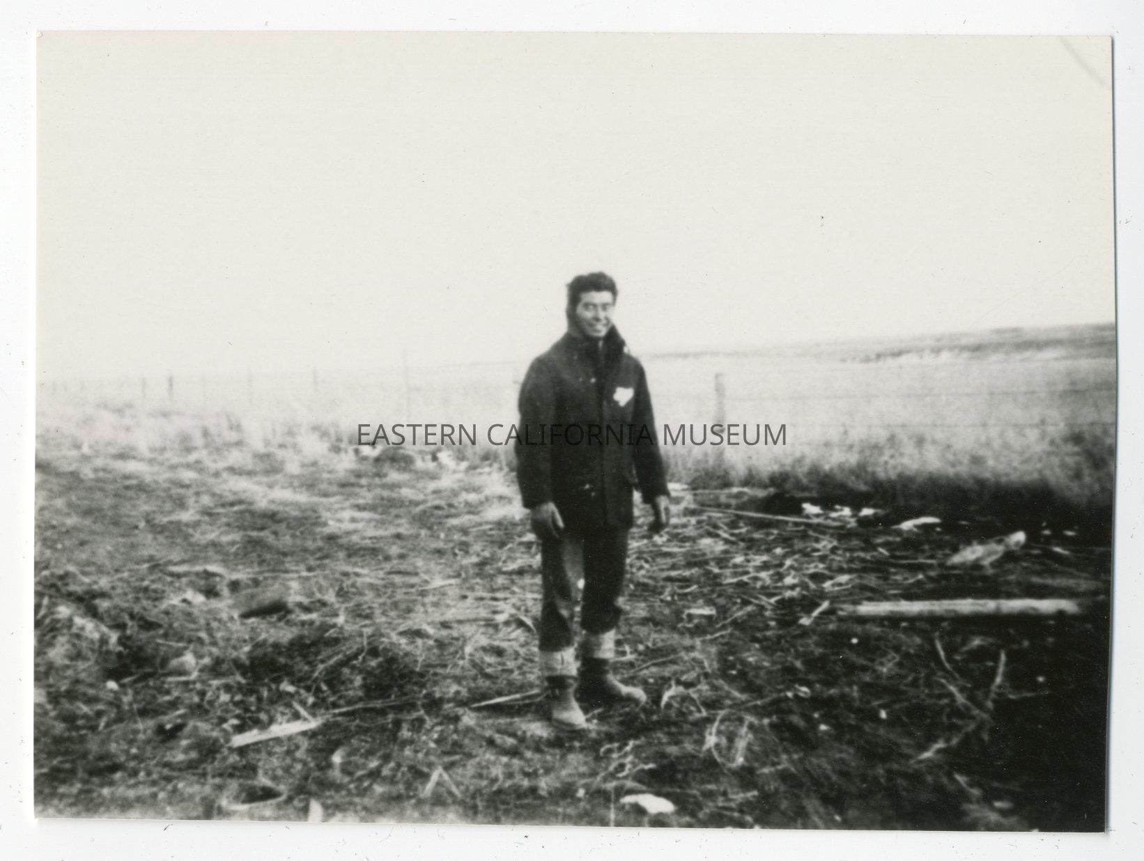 Copy of a photo of Shi Nomura in Montana, likely in October 1942. He is standing outside with a barbed wire fence in the background and a flat landscape. This copy was printed in April 1984.