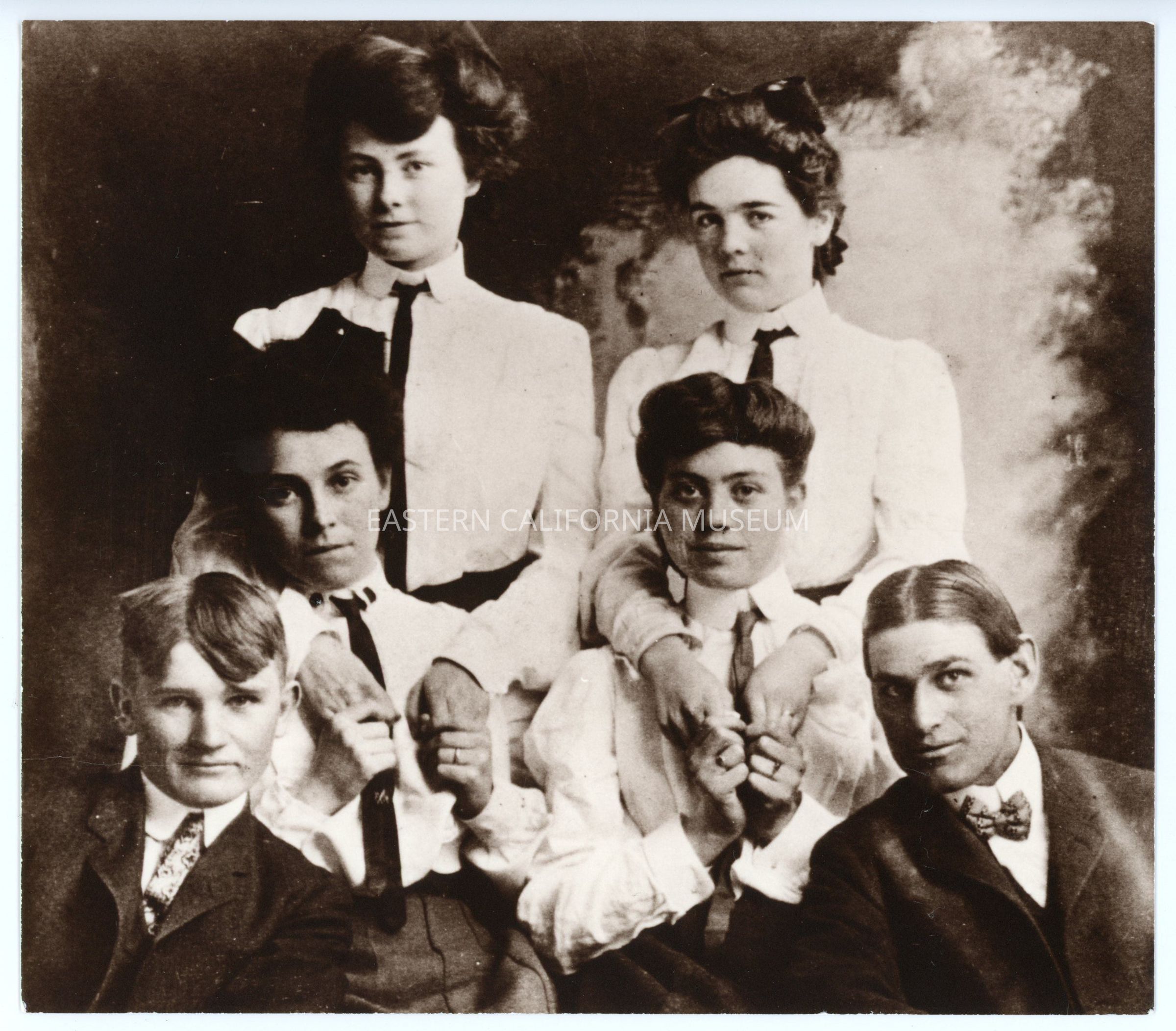 Written in blue ink on reverse: Class 1905 Bishop High SChool. Top row (LtoR): Hazel Gunter, Kate Bigelow. Center: Stella Jones, Alice Dunlap. Bottom: Claude Teel, Gus Cashbaugh. Copy of photograph sent to Alice Lindsey by Curtis Phillips, Bishop Photographer.Collection
