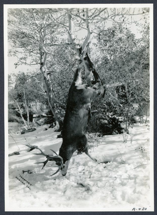 [No label, but it is described in the inventory as "Deer hanging from tree in snow."] Frasher's Pomona Cal. A-480