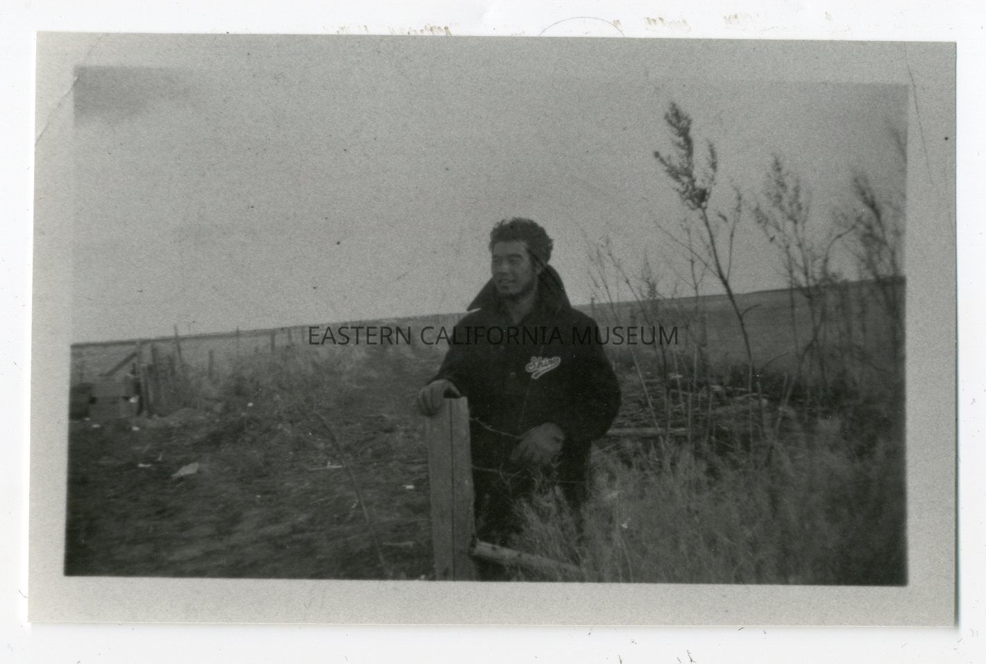 Copy of a photo of Shi Nomura in Conrad, Montana, likely in October 1942. He is standing outside with his hands on a barbed wire fence. This copy was printed in August 1985.