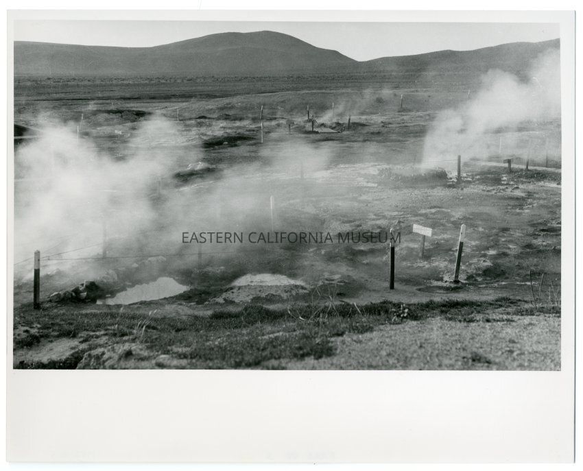 Black and white print of fenced off steaming hot springs and a sign that says, "Danger, Keep Out." Likely Coso Hot Springs region.