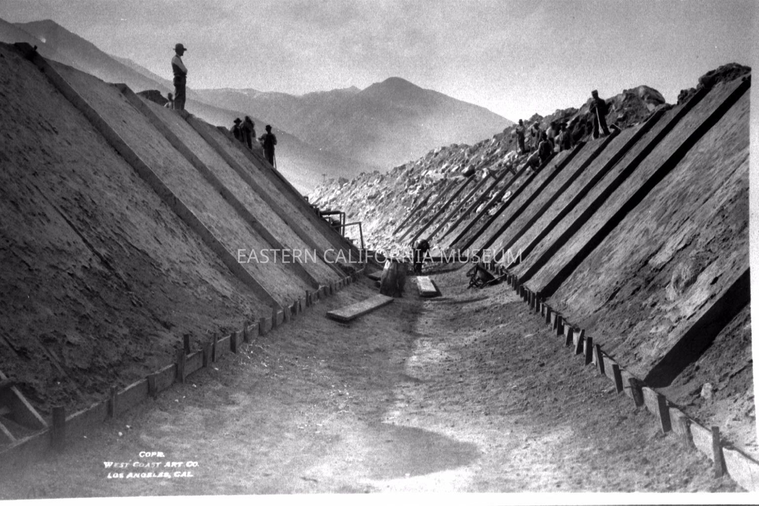 B & W digital scan of bottom of Open, Lined section of LA Aqueduct showing section already formed up for concrete (foreground) and a rough section just excavated (background) Sierra-Nevada Range in the background.Collection