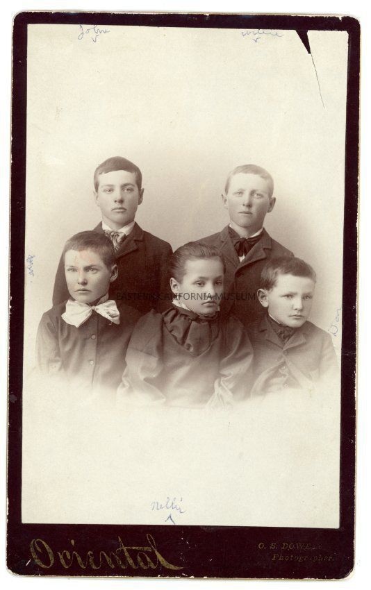 Mounted studio photo of the William Lyle Hunter, Sr. family. There are five children in the photo, which was taken in 1888. They lived in Cerro Gordo and Independence. Front row (LtoR): Beveridge Hunter, Nellie Hunter, Mark Donald Hunter. Back row (LtoR): John Hunter and William Lyle Hunter, Jr. Photographer was O. S. Dowe (Oriental Studio).Collection