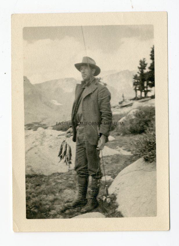 Small black and white photograph of a man holding a fishing pole and stringer of fish.