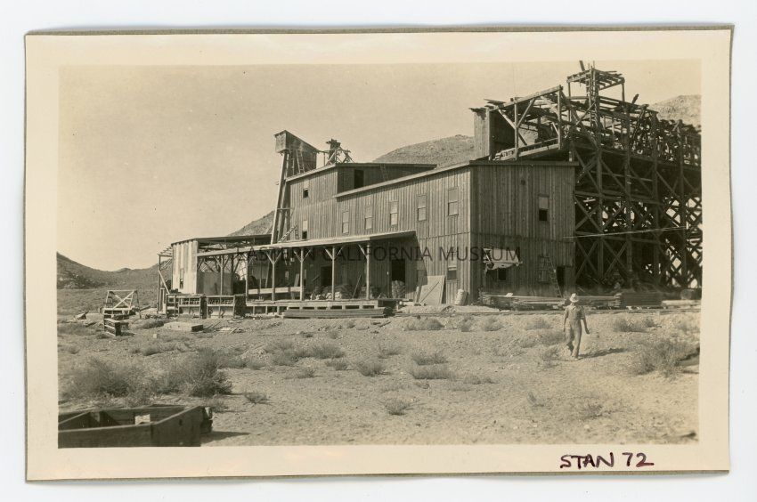 Photo of the Saline Valley Salt Tram mill at the terminus of the tramway, circa 1915-1916.