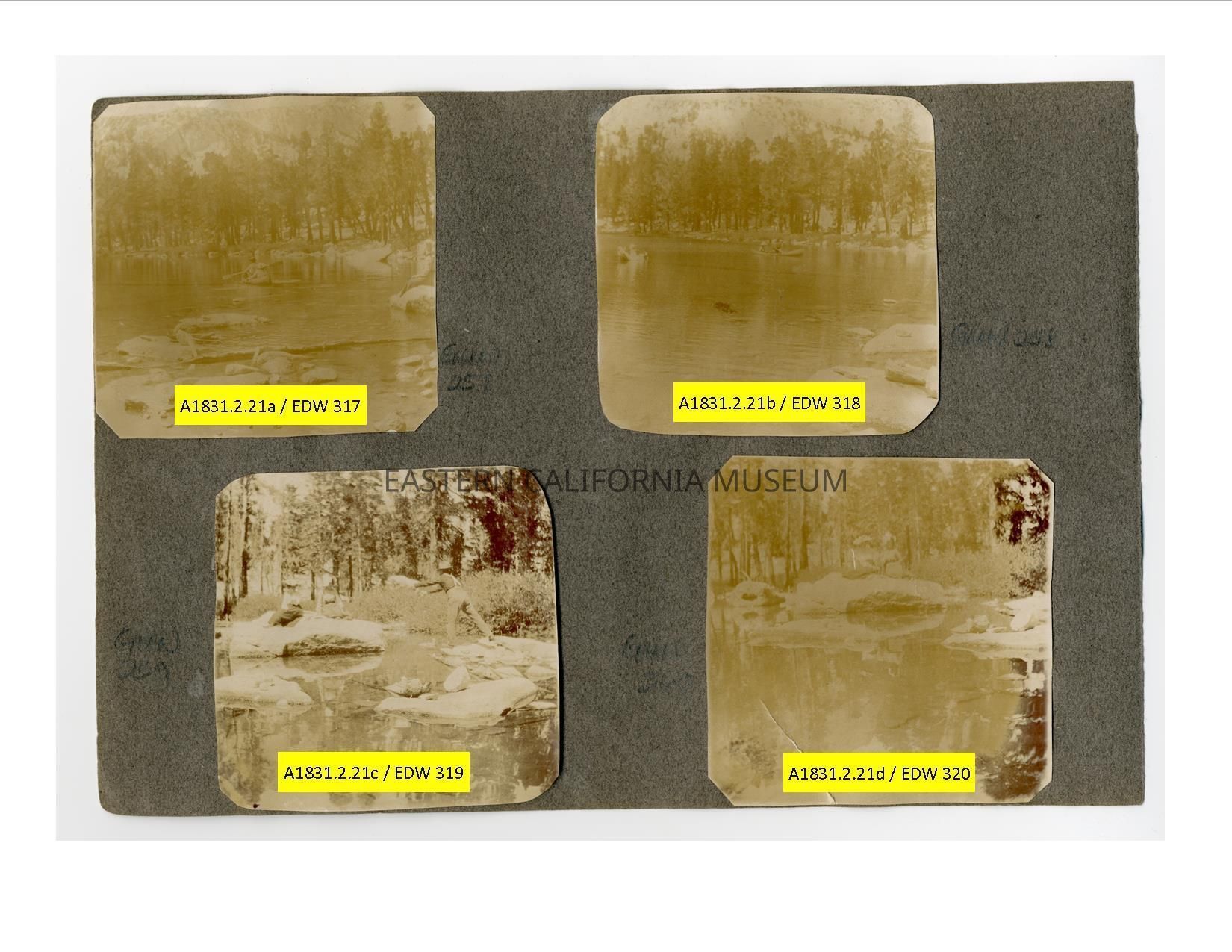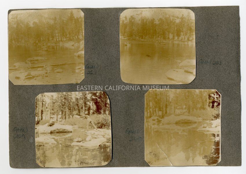 A1831.2.21c: Photo of a three people (two women and a boy or man) on rocks beside a mountain lake, possibly Flower Lake. Photo is badly faded.